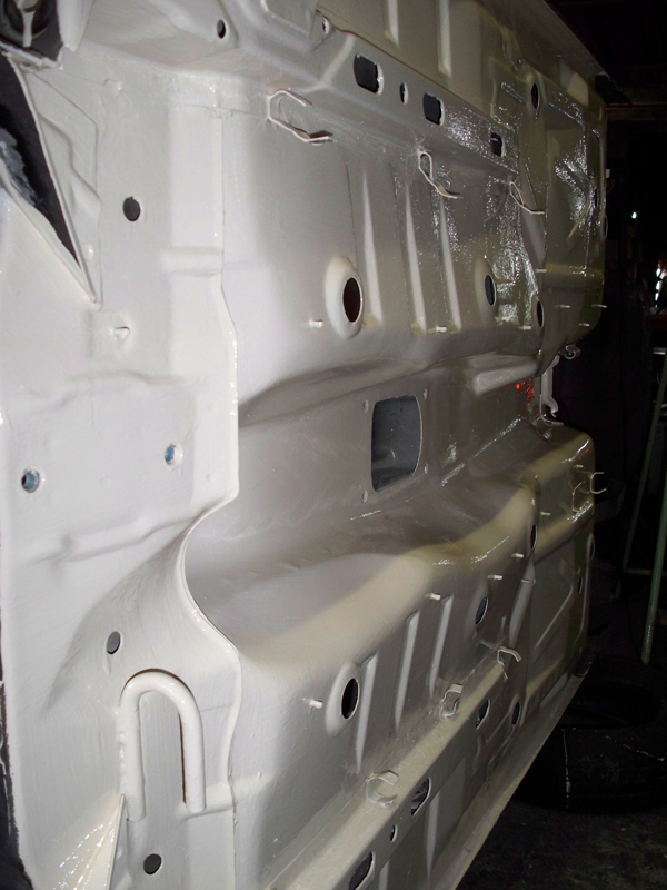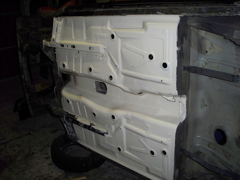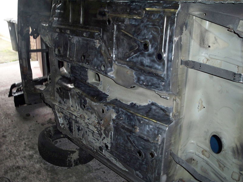 so gestern ging es weiter... haben den unterboden komplett sauber gemacht und ich hab die risse unter den sitzen ausgebohrt und neue bleche eingeschweißt. danach hab ich schonmal eine schicht des ersten wundermittels aufgetragen. ich finde das ergebnis kann sich sehen lassen :)