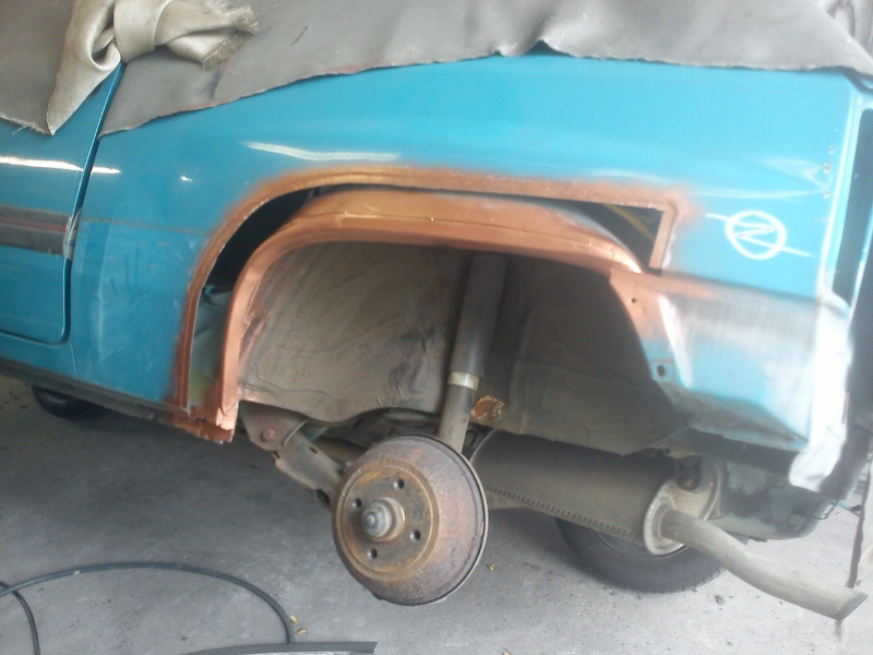 Gekauft hab ich den Wagen im Sommer 2012. Danach folgte ne Menge Arbeit. Vorn hatte er einen kleinen Auffahrunfall, also neuer Schlossträger, Haube und dann das übliche, Radläufe erneuern, Opelgold entfernen. Zum Schluss hab ich ihm noch eine Neulackierung spendiert, wieder im Originalfarbton, ein 60 / 40 Fahrwerk, neuen Unterbodenschutz. Eine Achsmanschette und Spurstange wollten noch gewechselt werden, frischer Unterbodenschutz und Hohlraumkonservierung. Für nächstes Jahr hab ich schon ein paar 15 Zoll Stahlfelgen parat, hab sogar die Auswahl. Einmal vom G Astra, eine ET 49 oder vom D Corsa mit einer ET 39. Die werden dann silbern lackiert um den originalen Look ein bißchen zu erhalten. Momentan überwintert er erstmal in einer trockenen Garage. So und nun Bilder!